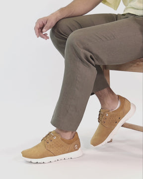 Men's sneakers. WATERPROOF Ochre Nobuck Leather. Lace-up Closure. Leather lining. Removable anatomical insole. Lightweight, flexible and strong EVA rubber sole. Heel height: 5 cm. 100% Made in Spain.