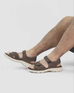 Men's sandals. WATERPROOF Grey Nobuck Leather. Velcro Closure. Lycra lining. Anatomical insole. Flexible and durable Polyurethane sole. Heel height: 5 cm. 100% Made in Spain.