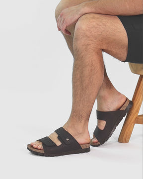 Men's sandals. WATERPROOF Brown nappa grass leather. Velcro Closure. Leather lining. Anatomical insole. Flexible and durable cork and Polyurethane sole. Heel height: 3 cm. 100% Made in Spain.