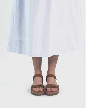 Flat woman's sandals. Natural suede. Velcro Closure. Leather lining. Anatomical insole. Lightweight, flexible, strong cork and EVA rubber sole. Heel height: 4.5 cm. 100% Made in Spain.