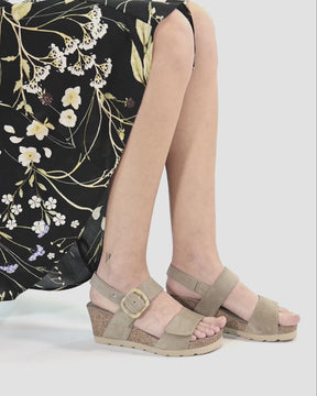 Wedge sandals. Taupe suede. Velcro Closure. Leather lining. Anatomical insole. Lightweight, flexible, strong cork and EVA rubber sole. Heel height: 6.5 cm. 100% Made in Spain.